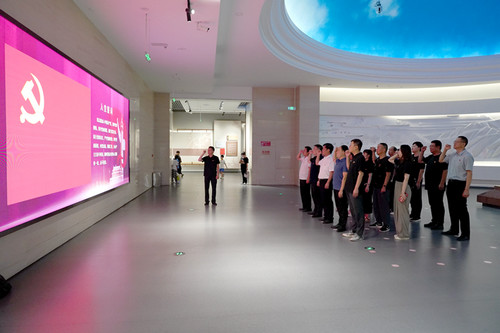 3.参观完纪念馆后,学员们在党旗下举起右拳,庄严宣誓,重温入党誓词,进一步坚定理想信念。